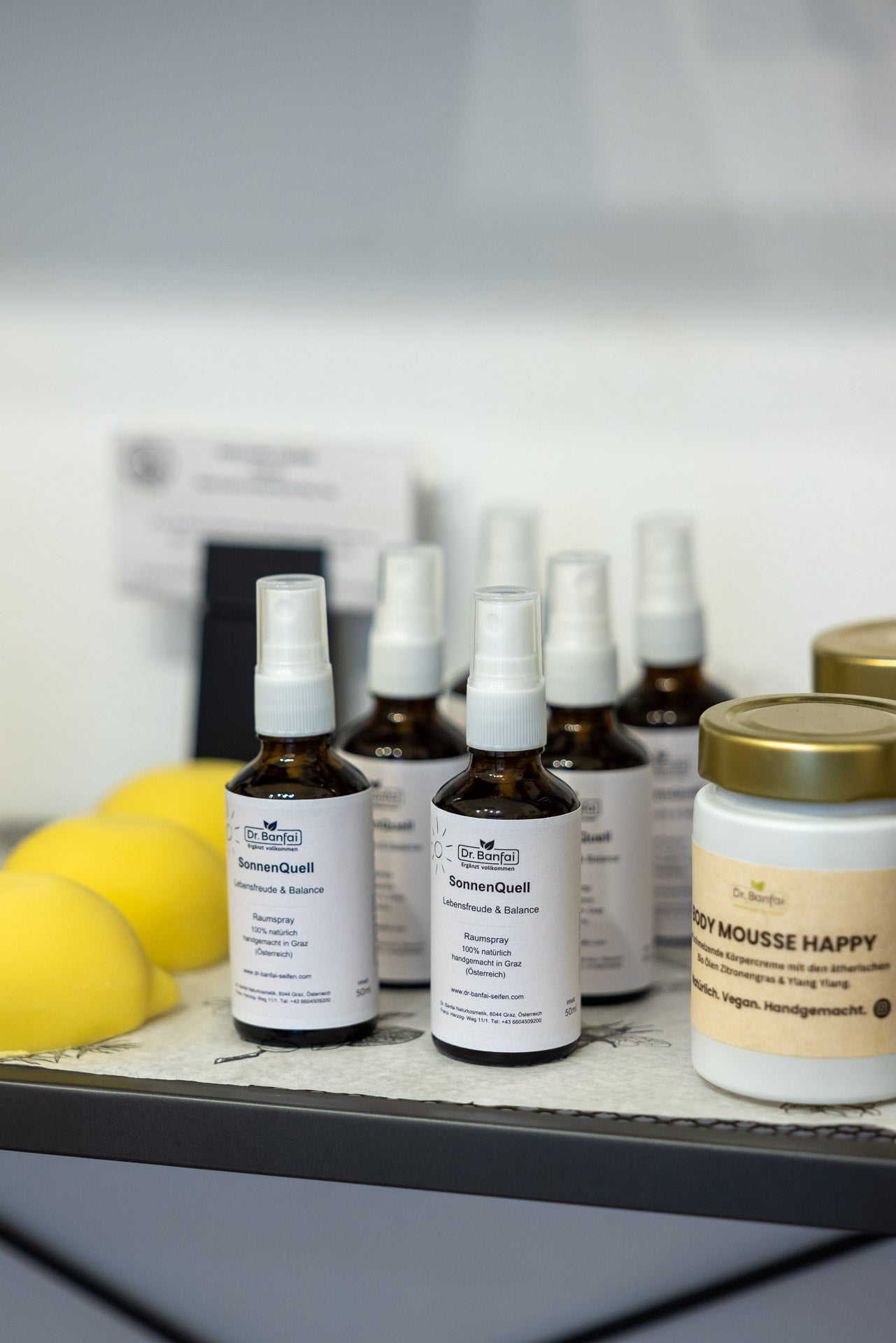 Auf dieser Basis stelle ich deine individuelle Duftkomposition zusammen. Aus 100 % naturreinen ätherischen Ölen und verarbeite sie zu einem maßgeschneiderten Aromaprodukt, z. B.: